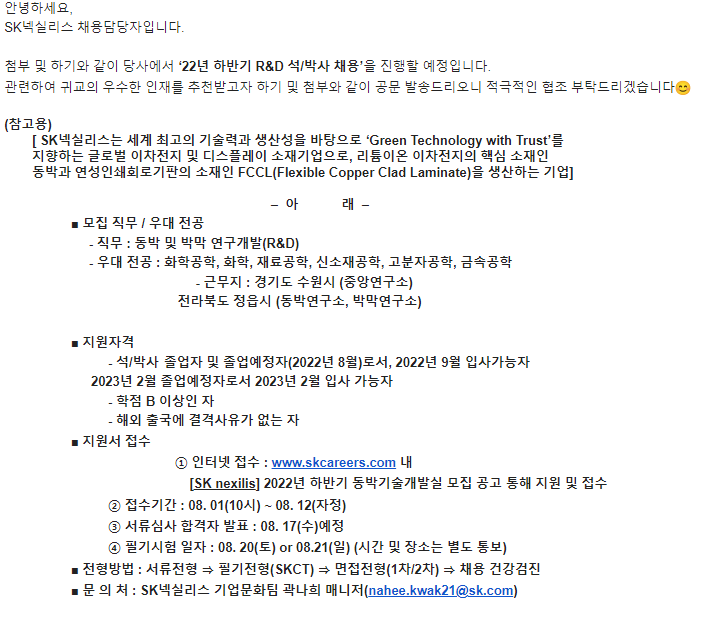 SK넥실리스 ‘22년 하반기 R&D 석/박사 채용’ 공지