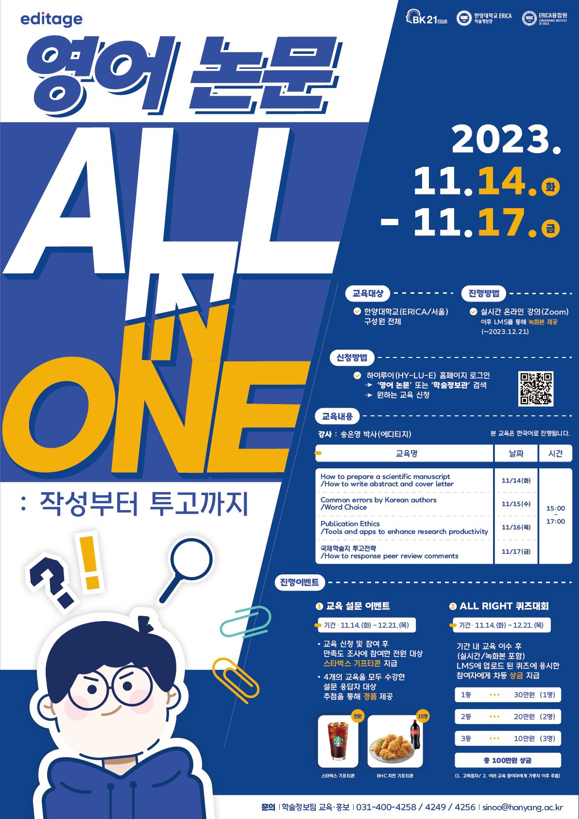 ERICA학술정보관에서는 「영어 논문 ALL IN ONE :작성부터 투고까지」교육을 진행합니다. 관심있는 분들의 많은 참여바랍니다.