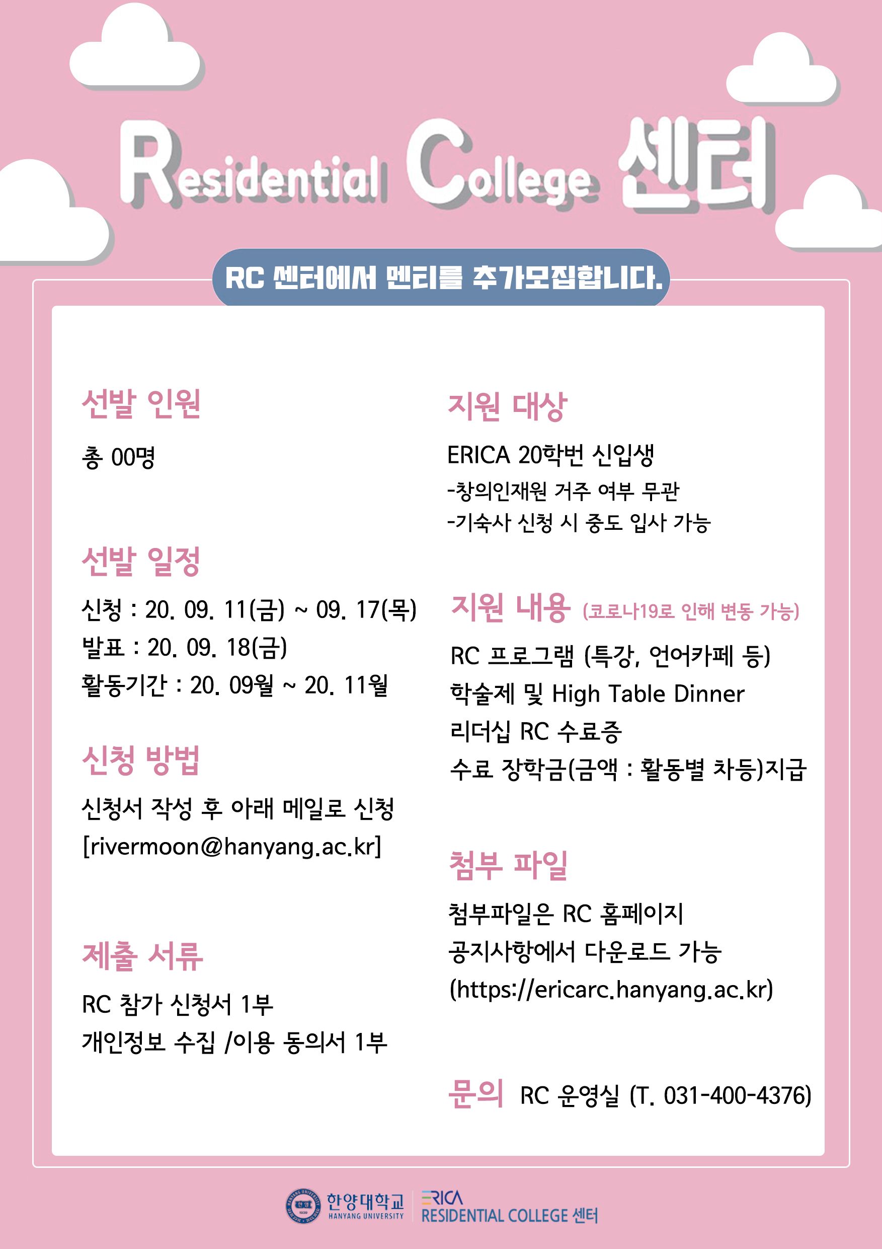 ERICA 한양인재개발원 Residential College 센터에서는 2020학년도 2학기에 활동할 멘티를 모집하고 있습니다.