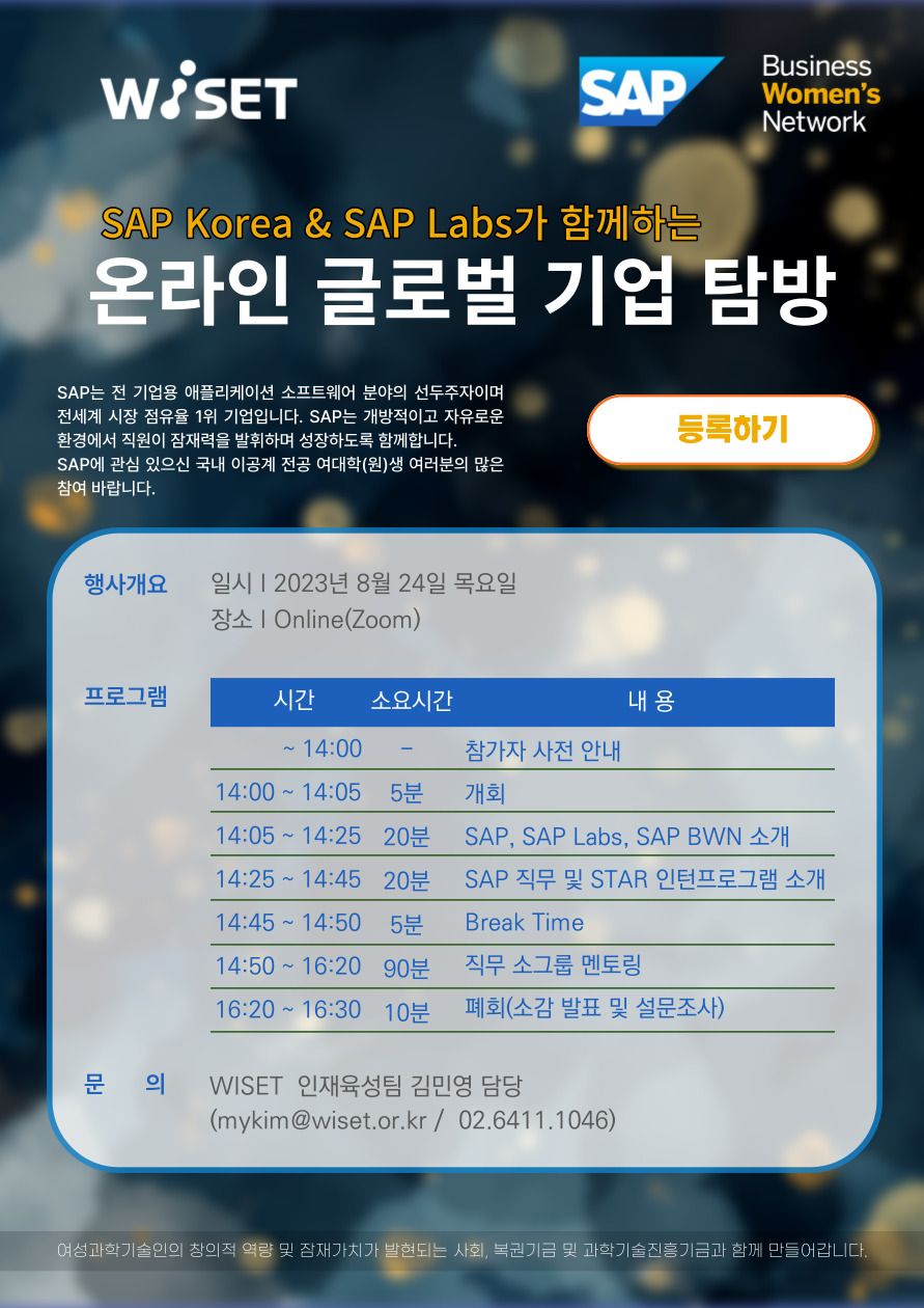 2023년 WISET 이공계 여학생 대상 온라인 글로벌기업 원데이 멘토링(SAP) 참여 안내