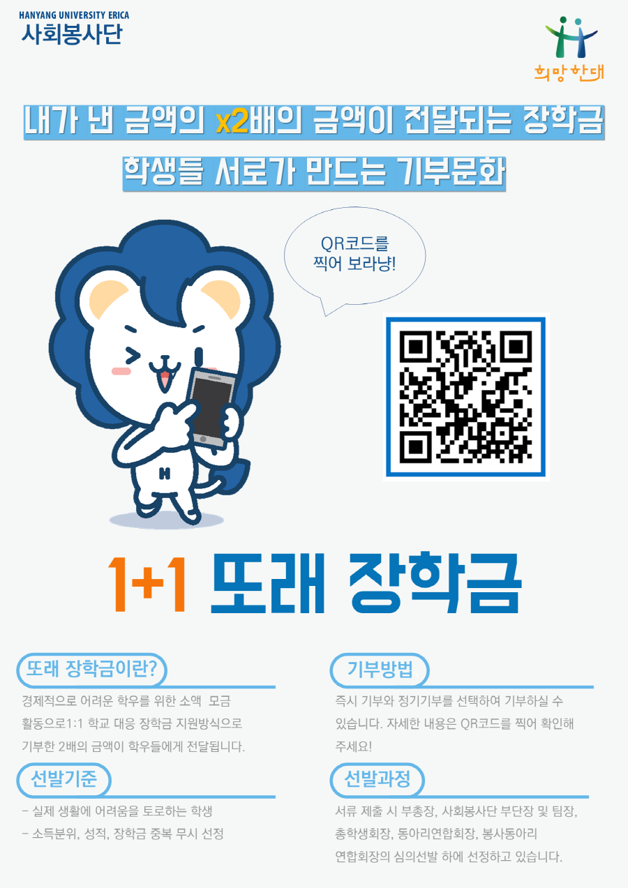 [사회봉사단] 2022『1+1 한양사랑 또래장학금』신청 안내