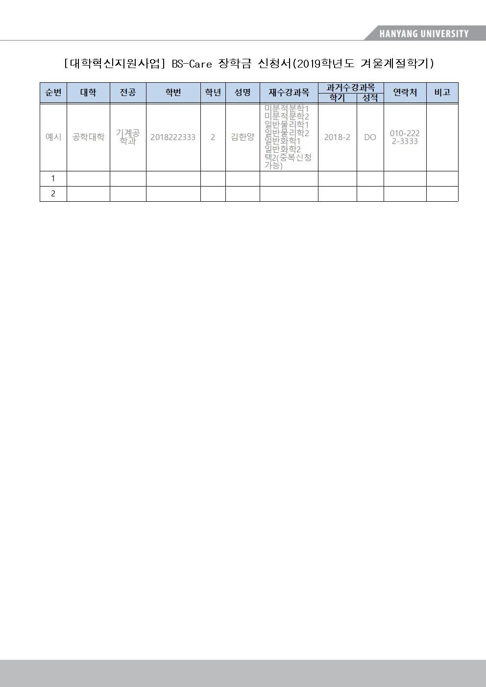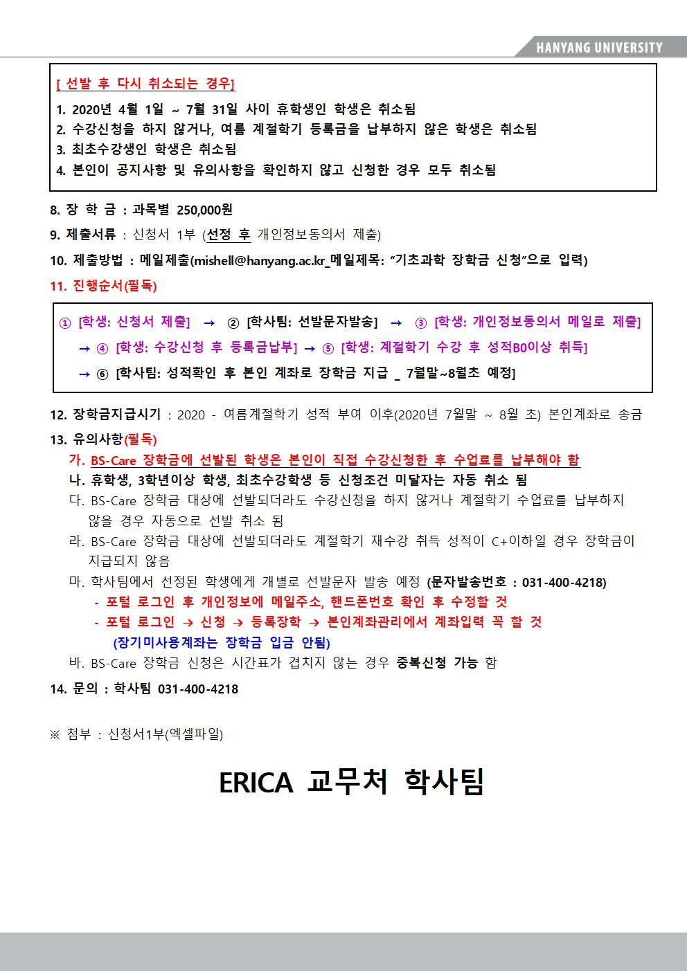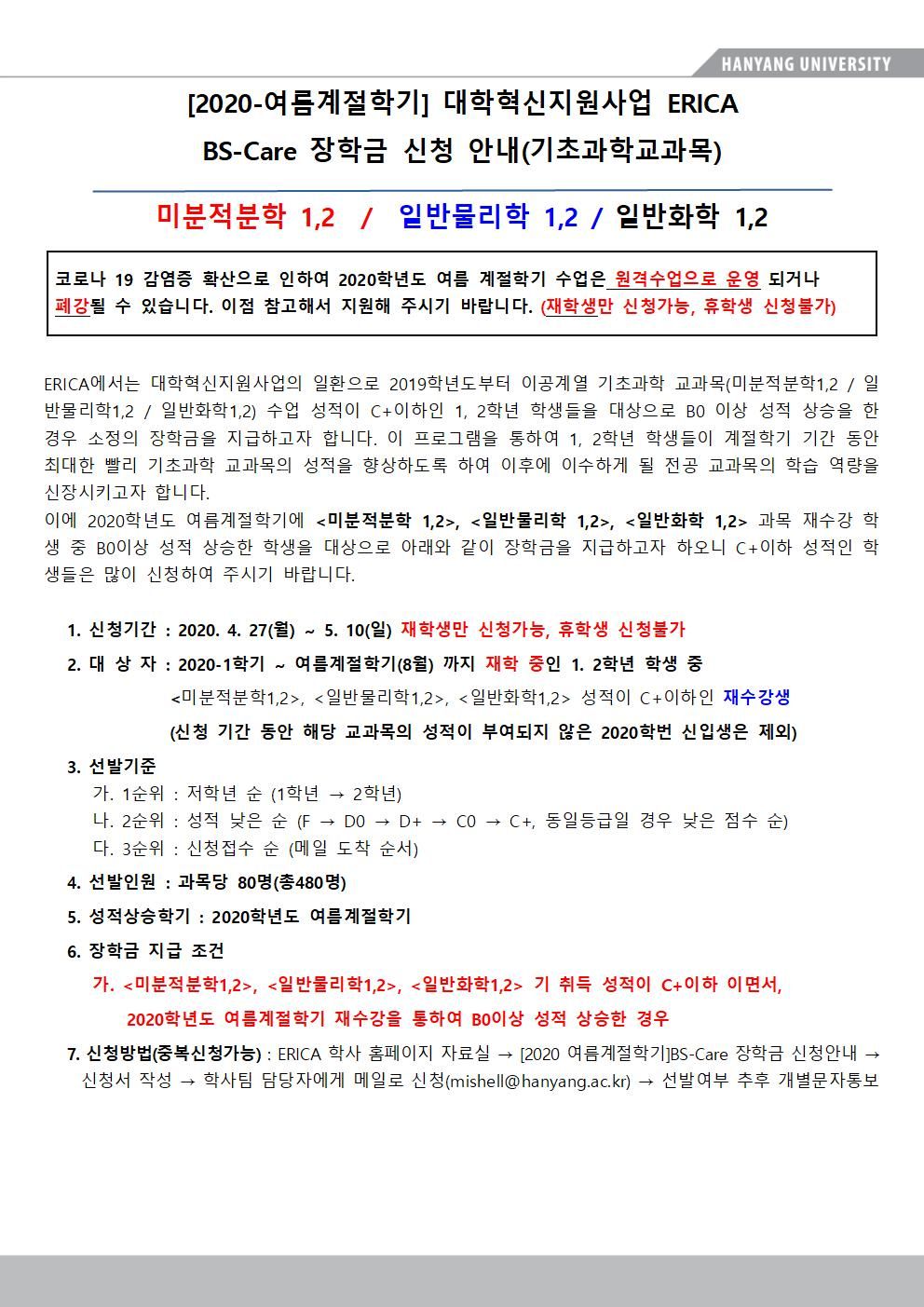 2020-여름계절학기 대학혁신지원사업 ERICA BS-Care 장학금 신청 안내(기초과학교과목)