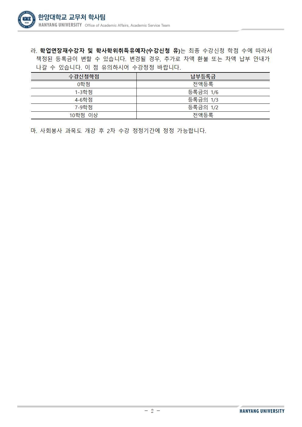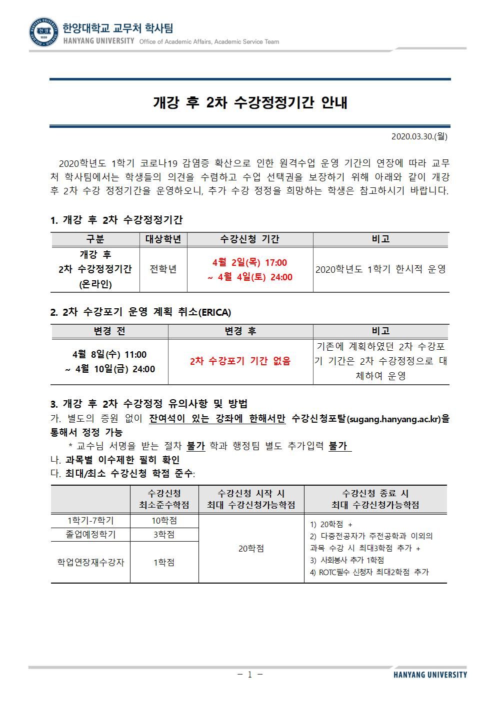 2020-1학기 개강 후 2차 수강정정기간 일정 안내