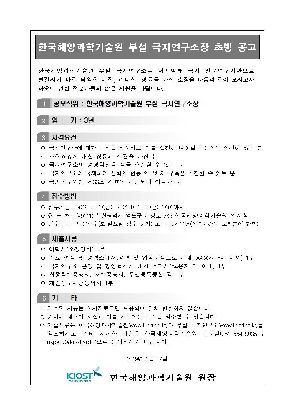한국해양과학기술원 부설 극지연구소장 초빙 공고