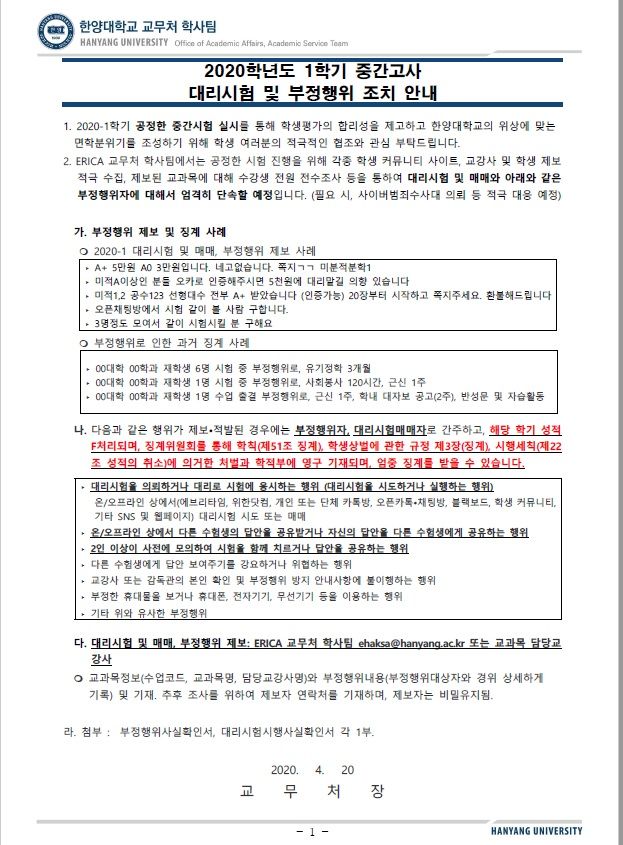 2020-1학기 중간고사 대리시험 및 부정행위 조치 안내