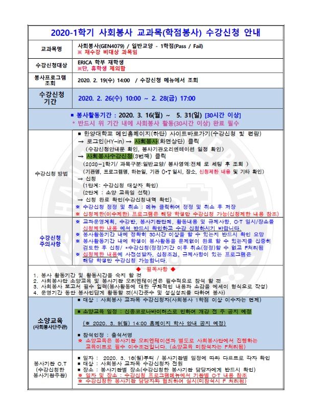 2020학년도 1학기 사회봉사 교과목(학점봉사) 수강신청 일정 변경안내