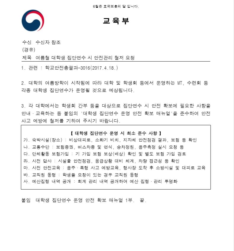 [교육부] 여름철 대학생 집단연수 시 안전관리 철저 요청